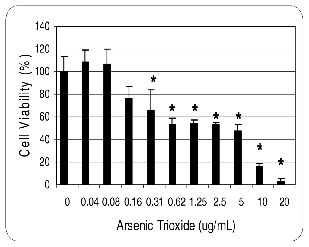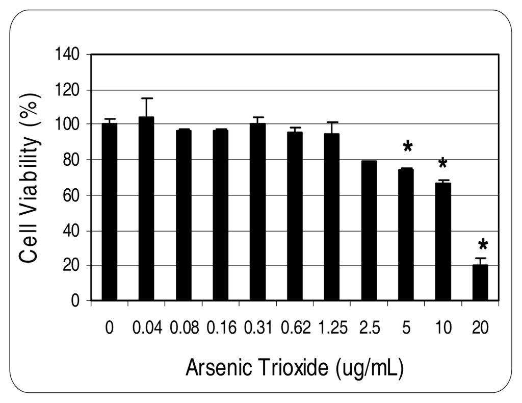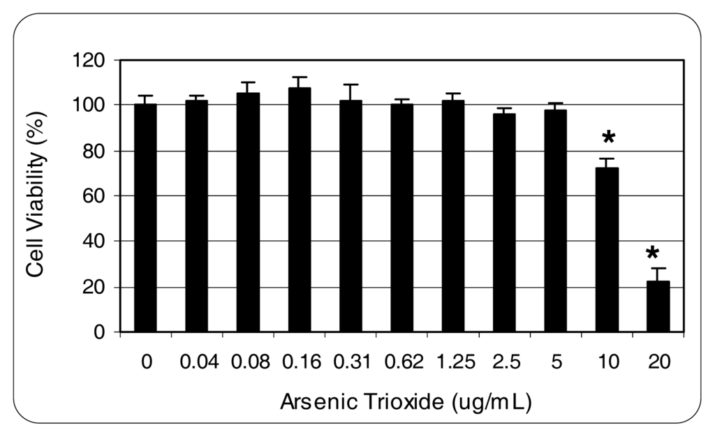 Toxicity of arsenic trioxide to human leukemia (HL-60) cells. HL-60 cells were cultured with different doses of arsenic trioxide for 6 hours as indicated in the Materials and Methods. Cell viability was determined based on the MTT assay. Each point represents a mean value and standard deviation of 3 experiments with 6 replicates per dose. Cell Viability in 10 and 20 μg/mL are significantly different (p < 0.05) compared to the control according to ANOVA Dunnett’s test.