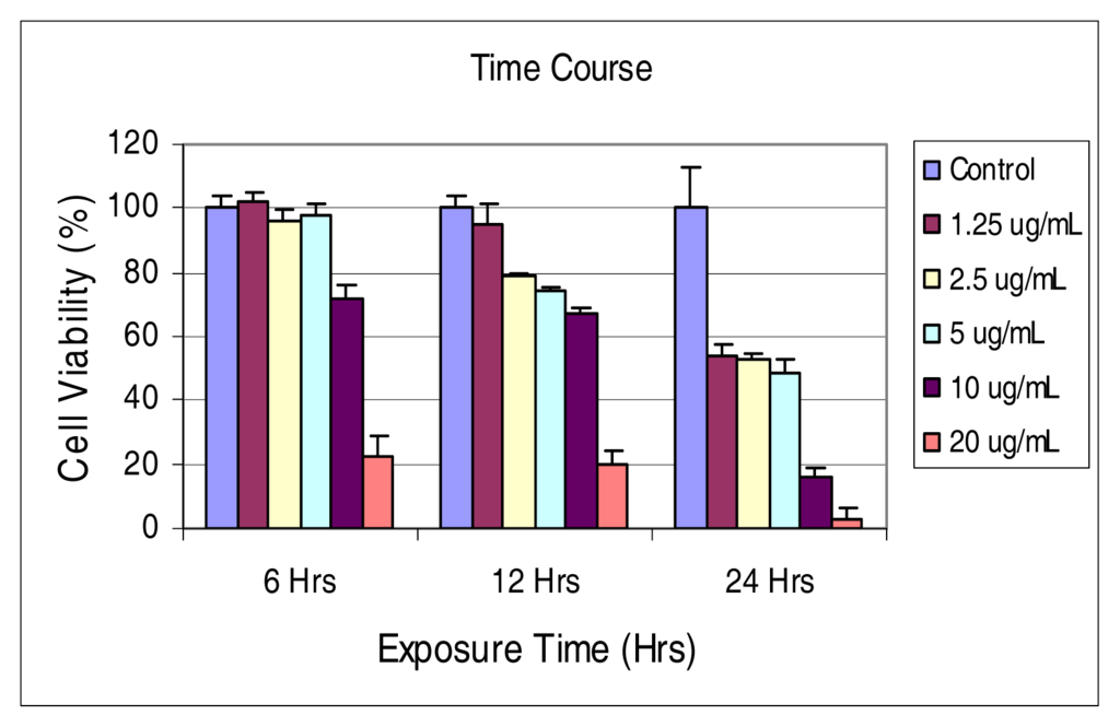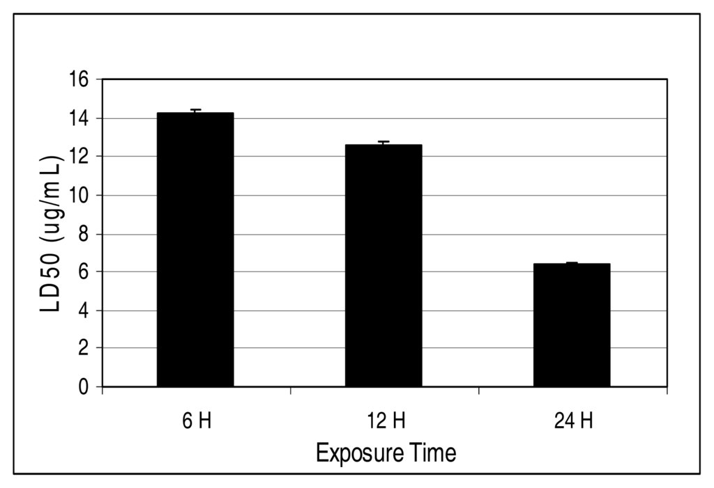 Time-response relationship with regard to the LD50 values of arsenic trioxide to human leukemia (HL-60) cells. LD50 = 14.26 ± 0.5 μg/mL for 6 h; 12.54 ± 0.3 μg/mL for 12 h; and 6.35 ± 0.6 μg/mL for 24 h of exposure.