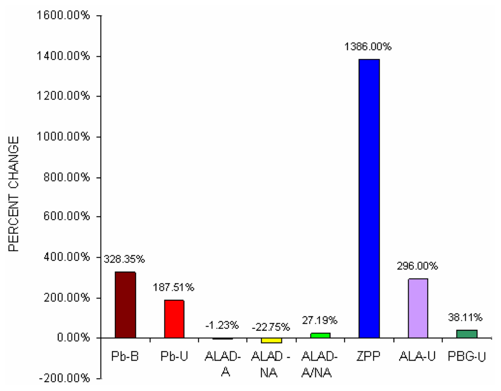 Percent change chart of lead concentration in blood (Pb-B), lead concentration in urine (Pb-U), activated erythrocyte d- aminolevulinic acid dehydratase (ALAD-A) non activated erythrocyte d-aminolevulinic acid dehydratase(ALAD- NA), activated and non activated erythrocyte d- aminolevulinic acid dehydratase ratio (ALAD-A/NA), erythrocyte- Zinc protoporphyrin (ZPP), d- aminolevulinic acid in urine (ALA-U) and Porphobilinogen in urine (PBG-U) of lead exposed battery manufacturing workers ( BMW ) group of western Maharashtra ( India ) with respect to control group.