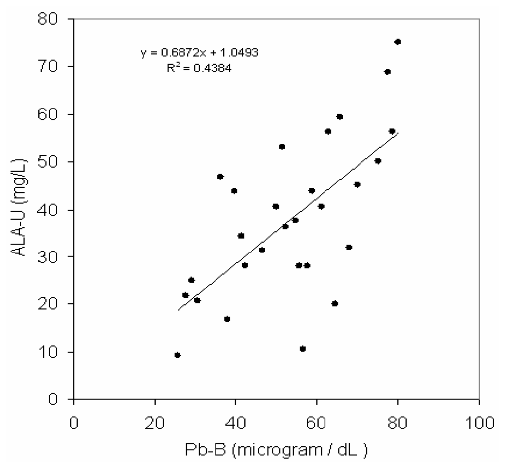 Relationship between blood lead concentration (Pb-B; range is 25.8 – 78.5 μg/dl) and d- aminolevulinic acid in urine (ALA-U) of lead exposed battery manufacturing workers (BMW) group of western Maharashtra (India); n = 28, Correlation coefficient (r) is 0.66, p< 0.001; y = 0.687x + 1.0493.