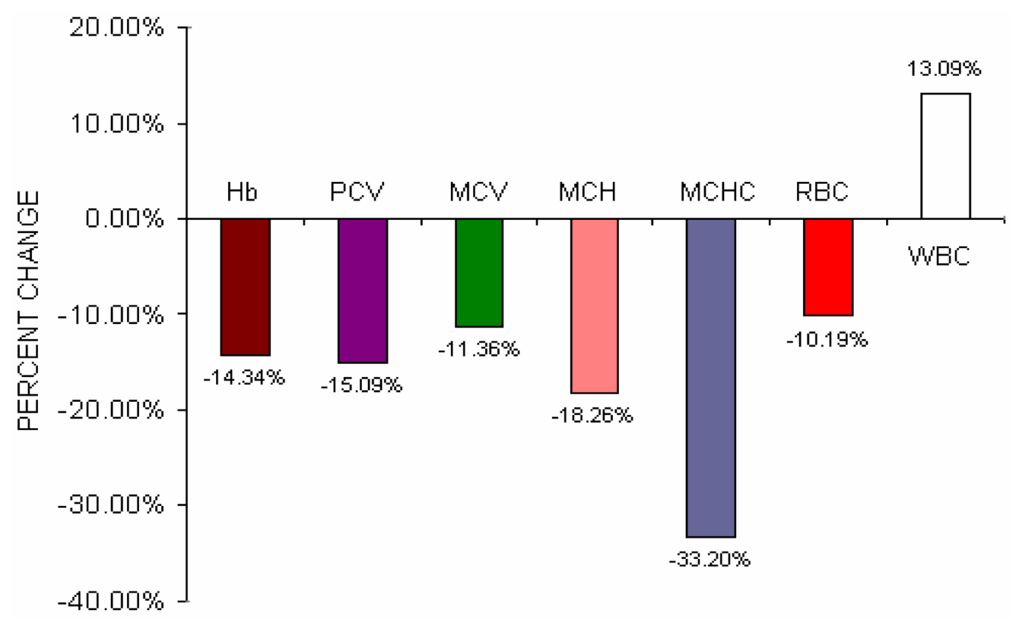 Percent change chart of hemoglobin concentration (Hb), packed cell volume (PCV), mean corpuscular volume (MCV), mean corpuscular haemoglobin (MCH), mean corpuscular hemoglobin concentration (MCHC), total erythrocyte count (RBC) and total leukocytes count of lead exposed battery manufacturing workers (BMW) group of western Maharashtra (India) with respect to control group.