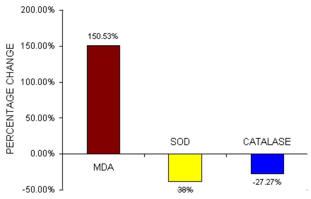 Percent change chart of serum malondialdehyde, erythrocyte-superoxide dismutase (SOD) and erythrocyte-catalase activities of lead exposed battery manufacturing workers (BMW) group of western Maharashtra (India) with respect to control group.