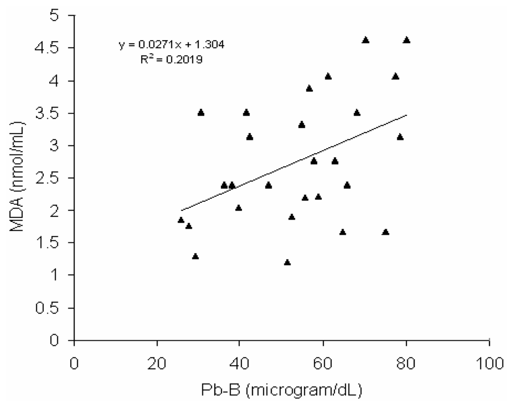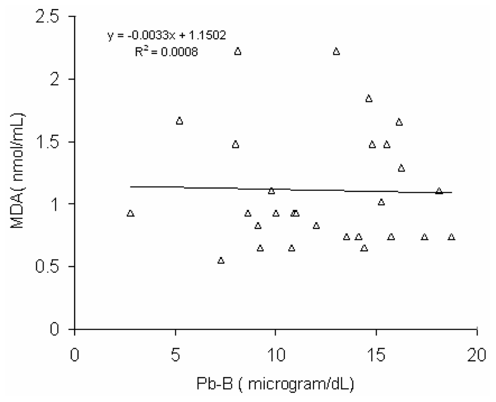 Fig 6 shows a positive correlation (r = 0.45, p < 0.02) between blood lead concentration (Pb-B) and serum MDA level in BMW group (Pb-B range is 25.8 – 78.0μg/dl). No such correlation (r = 0.028) was observed in control group (Pb-B range is 2.8 – 22.0 μg/dl) (Fig 7).