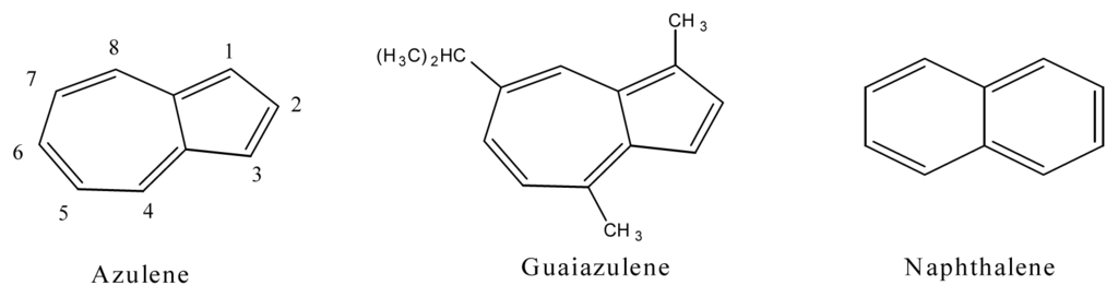 Azulene is a non-alternate hydrocarbon, consisting of an unsaturated seven member ring fused with an unsaturated five member ring (Figure 2). It absorbs red light in the visible region (600 nm band) for the first excited state transition and UVA light (330 nm band) for the second excited state transition and produces a beautiful blue color in aqueous solutions []. This is drastically different from naphthalene, which absorbs light only in the UVB region (<315 nm).