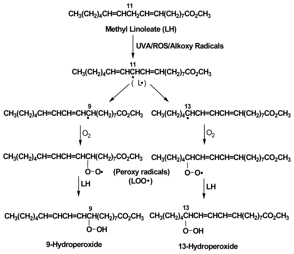 Peroxidation of methyl linoleate into the isomeric 9- and 13-hydroperoxides.