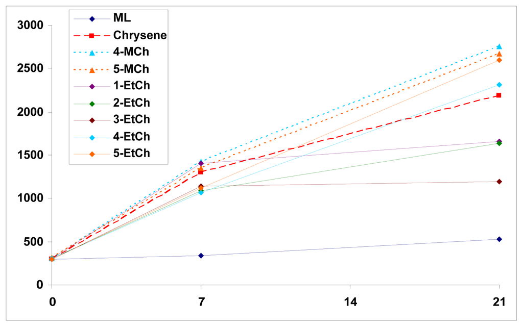 The authors are also interested in determining whether or not photoirradiation of PAHs can lead to induce lipid peroxidation. The approach is to perform the photoirradiation of a series of chrysene and its isomeric methylchrysenes and ethylchrysenes by UVA light in the presence of a lipid, methyl linoleate. Upon peroxidation, methyl linoleate is converted into the isomeric methyl linoleate 9- and 13-hydroperoxides, both in trans- and cis-forms (Figure 3). We have previously reported the employment of methyl linoleate for study of lipid peroxidation induced by chrysene, 4-methylchrysene, 5-methylchrysene, 1-ethylchrysene, 2-ethylchrysene, 3-ethylchrysene, 4-ethylchrysene, and 5-ethylchrysene, concomitantly exposed to UVA light (unpublished data). The results indicate that all are capable of inducing lipid peroxidation (Figure 4). The results also indicate while 4-and 5-ethylchryses induce lipid peroxidation at a level similar to that of chrysene, 1-, 2-, and 3-ethylchrysene are weaker than chrysene in induction of lipid peroxidation.