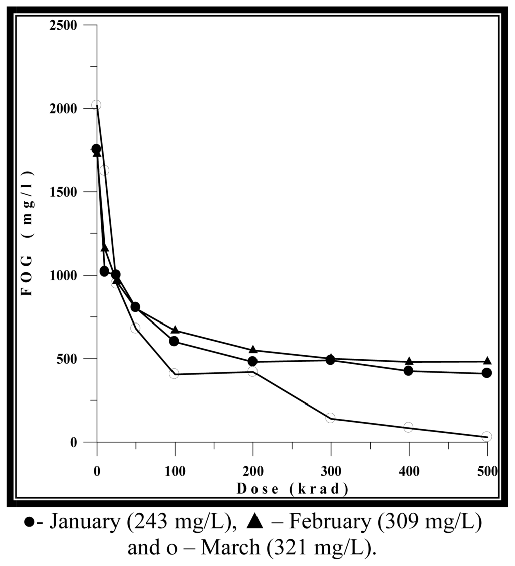Figure 10 and Table 1 show the decrease of FOG concentrations as the absorbed radiation dose increased. Fat, oil and grease values were reduced by radiation to 23.4%, 27% and 1.4% of their initial values for January, February and March, respectively. FOG is composed of long chains of hydrocarbons. The radiation energy lysed the bonds of these hydrocarbon chains converting the FOG to shorter hydrocarbon fragments. These findings agree with previous results [7, 14]. The degradation of FOG depends on the presence of mineral FOG. It is known that radiation does not degrade the mineral FOG [3]. These new compounds have certain characteristics and composition that differ from FOG, and have fewer impacts as wastewater hazards.