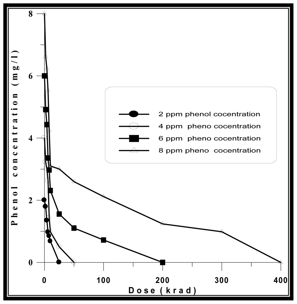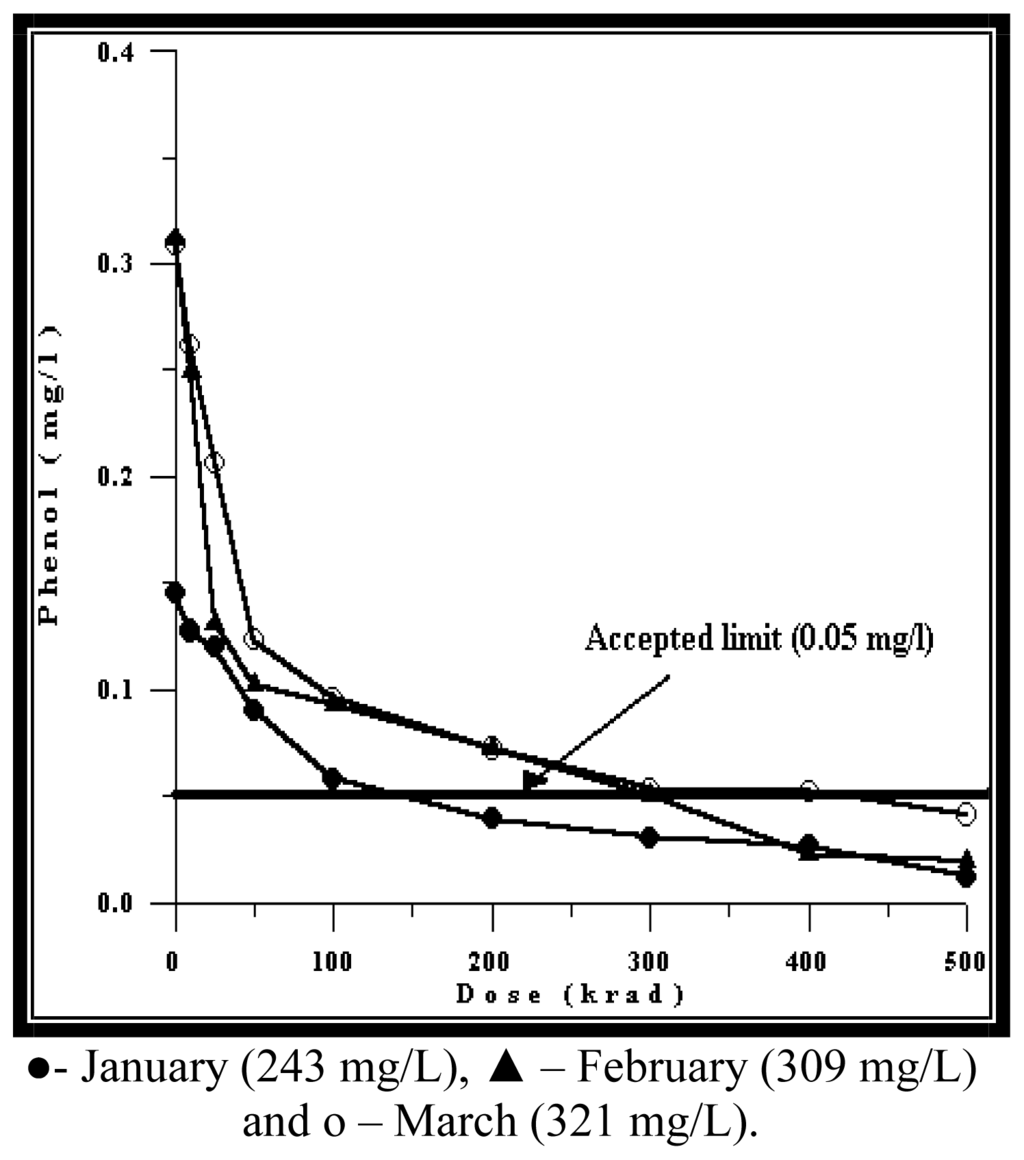 All these values at final absorbing dose of radiation are within the in accepted range (see Tables 1 and 2). They varied from 8.4% of their initial value in January, 6.2% for February and 13.16% for March, respectively. The decrease in the concentration of phenol agreed very well with the results of Takehtsa & Sakumoto [15] and Machi [16]. The degradation of phenol samples never reached zero concentration value, while standard solutions of phenol reached zero concentration. This is because the standard solutions of phenol are pure, while the samples of wastewater contain different types of phenols such as chlorophenols and nitrophenols that contain surfactants.