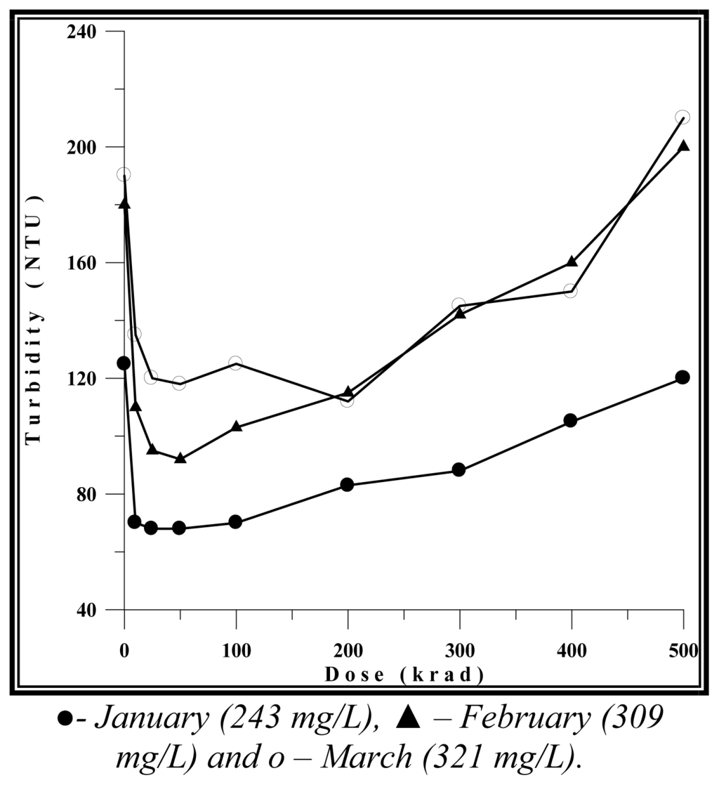 Turbidity decreased to 68 NTU at 25 krad for January and 92 NTU at 50 krad for February and 118 NTU at 50 krad for March, respectively. Then the values increased to 120, 200 and 210 NTU for January, February and March, respectively at an irradiation dose of 500 krad. Sometimes turbidity surpassed the starting value. This increase in turbidity was attributed to the dissolved organic materials in the sludge [3].