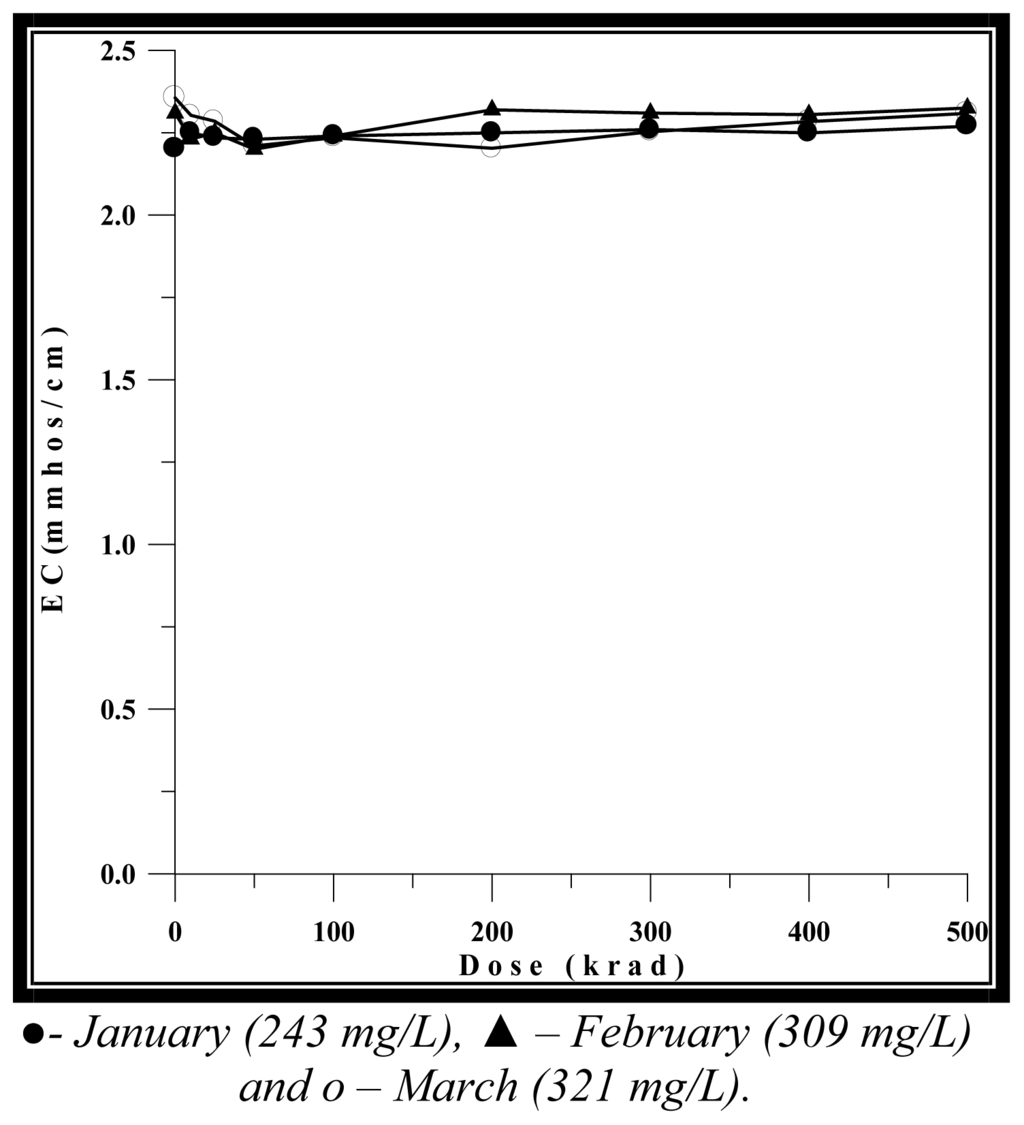 Results revealed that EC values and hardness remained stable with the increase in radiation dose (Fig. 3). This is because EC and hardness are functions of dissolved salts in water. It is known that the organic salts are not conductive materials, but the inorganic salts are very conductive materials when dissolved in water since they are electrolytes. Moreover, the radiation doses do not degrade the inorganic materials consequently the salinity value does not change with the increase in radiation dose. Therefore, EC (2.25mmhos/cm) and hardness (800mg/L as CaCO3) values remained stable (Table 1) as previously shown in an earlier I.P.S. work, [7].