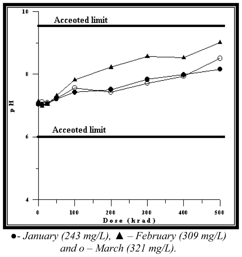 pH increased as the radiation dose increased. Figure (4) shows that pH values tended to increase as a result of the radiolysis of water. These values reached 8.1, 9.0 and 8.5 for January, February and March, respectively. This pH increase resulted from the increase of hydroxyl radicals at very large quantities due to the hydrolysis of water. The G-value of OH (G-OH) is high when compared with the other radicals, which caused a large concentration of free hydroxyl radicals in water consequently increasing the pH value. All pH measurements remained within accepted values, as shown in (Tables 1 and 2).