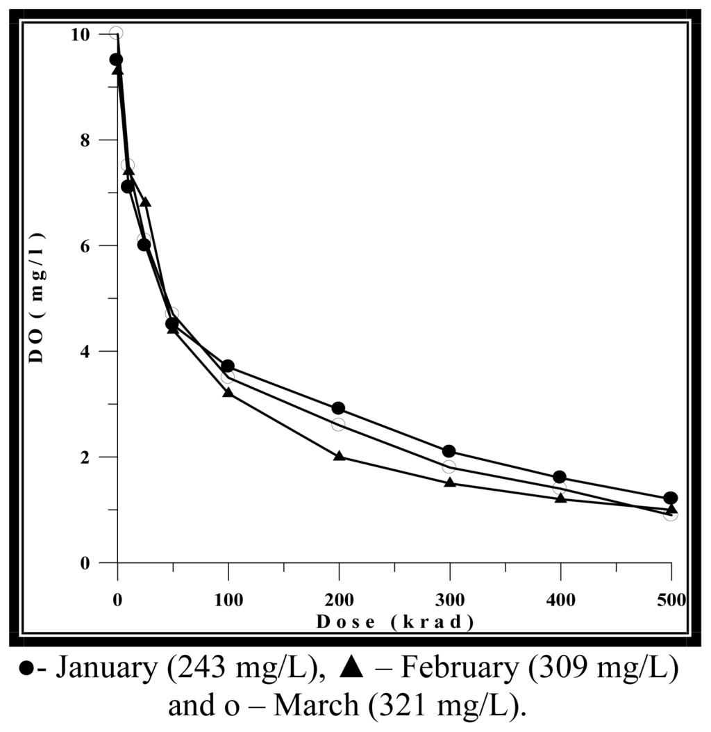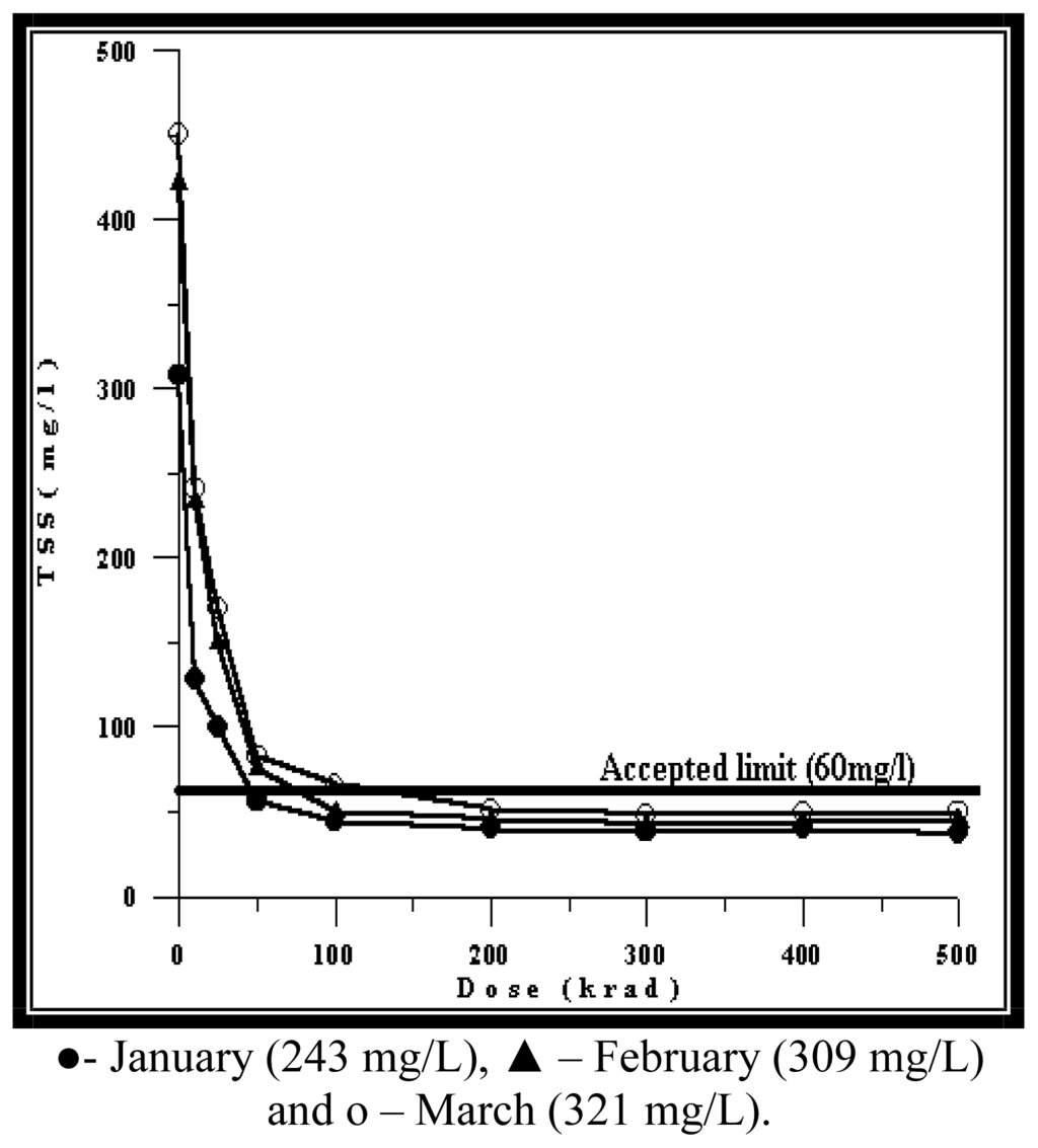 Figure 8 shows the decrease in total suspended solids (TSS) as the absorbed radiation dose increased. For the three months, January, February and March, the removal percentage reached 18.2 %, 11.85% and 11.23% of the initial values, respectively. All these values were within the accepted range (see Tables 1 and 2). The total suspended solids (TSS) were decreased, as they were converted to precipitates resulting from the degradation of organic substances and suspended matter in wastewater. These results are in agreement with previous work of I.P.S. [7], Compton [12], and Undynamic Corporation (U.C.) [13].