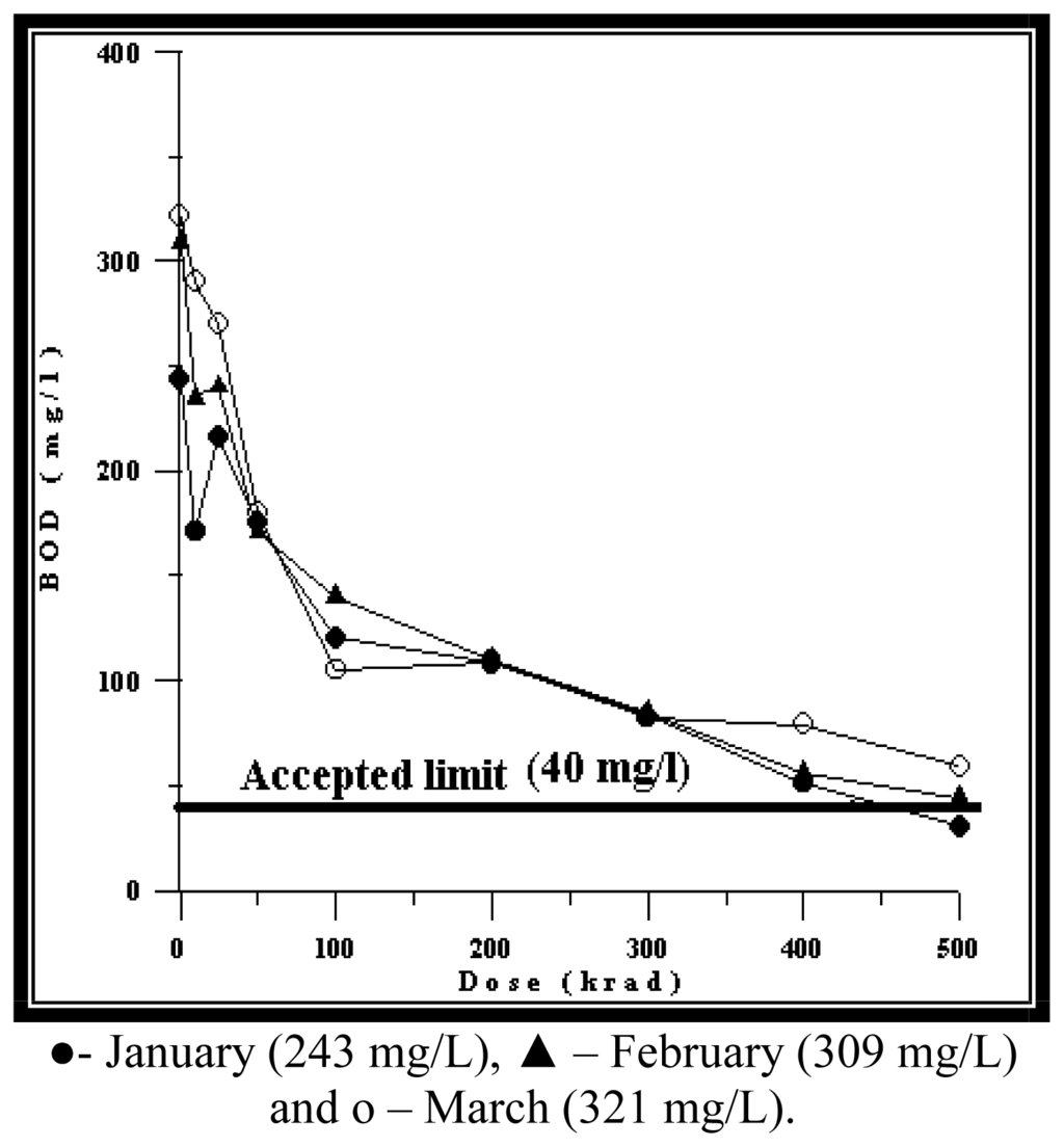 The BOD5 values reached 12.3% of their initial value through the use of 500 krad absorbing dose, while the accepted value of BOD5 is 40 mg/l, (Tables and 2). However, in March, the concentration of BOD5 at the same radiation dose remained high, but they were within the accepted value. This observation can be explained by the fact that sometimes samples contain surfactant pathogens such as Bacillus spores and Micrococcus radiodurant and mineral organics, which are not degraded by radiation. To reduce these types of pathogens, the combined processes must be used (i.e., radiation with either heat or ozone) [8].