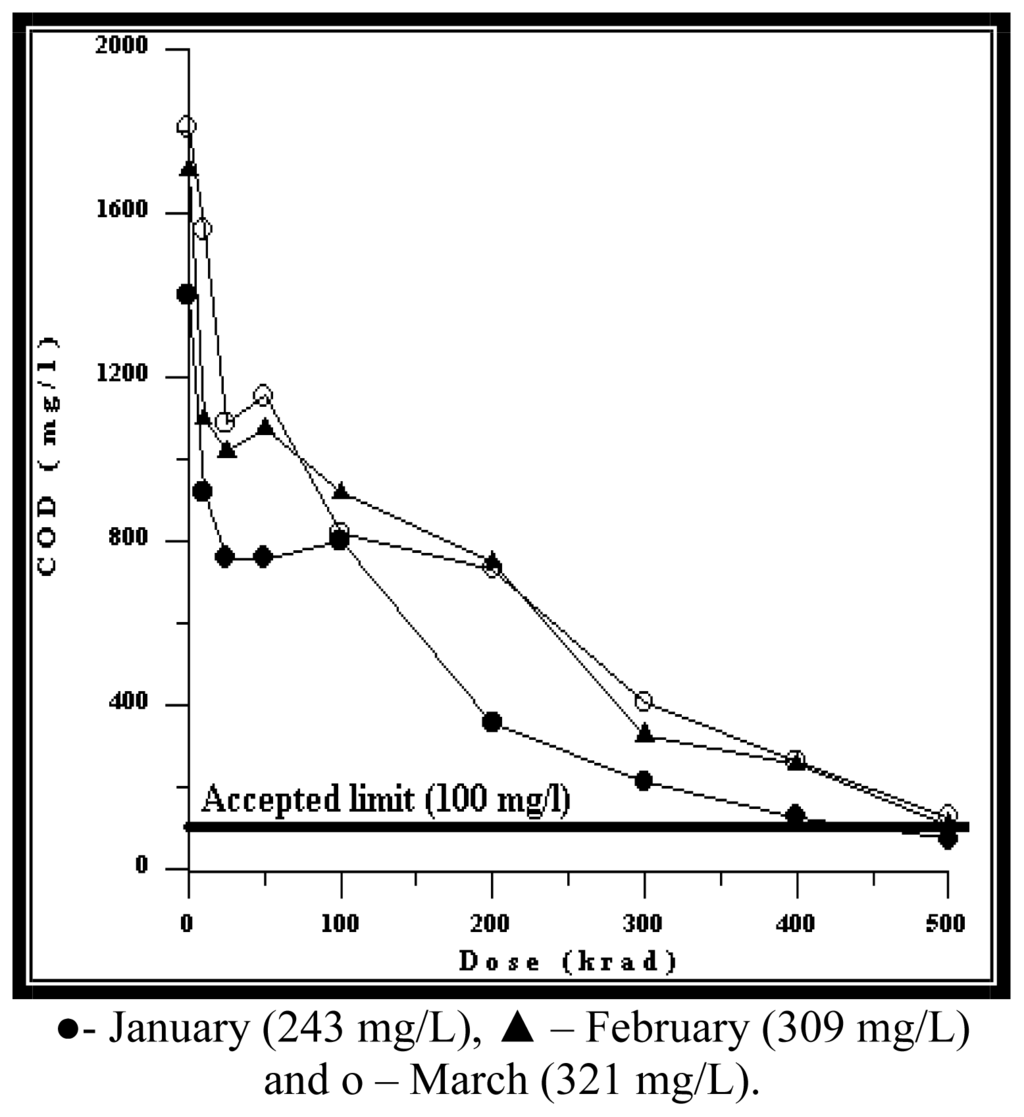 (COD) values show the attainment of the acceptable value for January but were higher than the accepted value in February and March (see Tables 1 and 2). To achieve the accepted values in February and March, higher radiation doses were needed. This decrease in BOD5 and COD matched previous research reports from I.P.S. [7], Compton et. al [9]; Etzel & Condern [10], Mytelka [11].