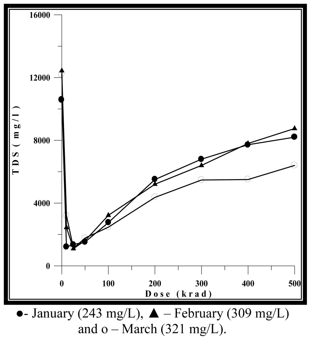 Total Dissolved Solids (TDS) concentrations showed different patterns of interaction with radiation doses. The TDS concentration decreased with respect to the increase in the absorbed radiation doses to certain values, after which TDS concentration increased with increases in absorbed radiation dose. Based from Fig 9 and Table 1, the TDS concentration decreased to 11.4% of its initial value at 10 krad absorbing dose then it increased to 77.5% at 500 krad for January and February. The concentration decreased to 8.85% of it’s the initial value at 25 krad then it increased to 70.4%. For March, it decreased to 9.2% at 25 krad then it increased to 52.4% at 500 krad. This might be due to the conversion of the dissolved organic substances to simple molecular compounds or formation of dimmers or trimmers. Also, the high doses may have dissolved the suspended solids and sludge that were at the bottom of the container, thus increasing the concentration of TDS It was noted however that the TDS values never reached the starting values [1]. Since the inorganic materials were not altered by radiation, our results are similar to an earlier I.P.S. finding [7].
