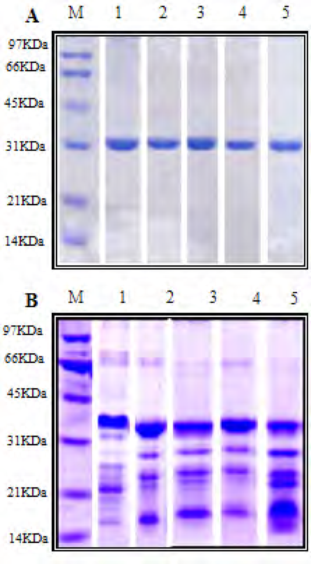 SDS-PAGE analyses of polyhedra (A) and ODVs (B) of AcAaIT (lanes 1), AcAaIT-laboratory (lanes 2), AcAaIT-field (lanes 3), AcMNPV (lanes 4), and SlNPV (lanes 5). The molecular weight of size standards (lanes M) are indicated to the left.