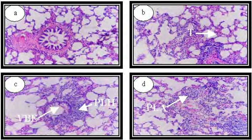 Histopathology of lung from female rats treated with saline (a) showing normal pulmonary tissue; AcAaIT (b) showing mild thickening (T) of some interaveolar septa; AcMNPV (c) showing vaculated bronchialar epithelium (VBE) and peribronchial lymphoid hyperplasia (PLH); and SlNPV (d) showing perivascular lymphoid aggregates (PLA) (H&E ×300).