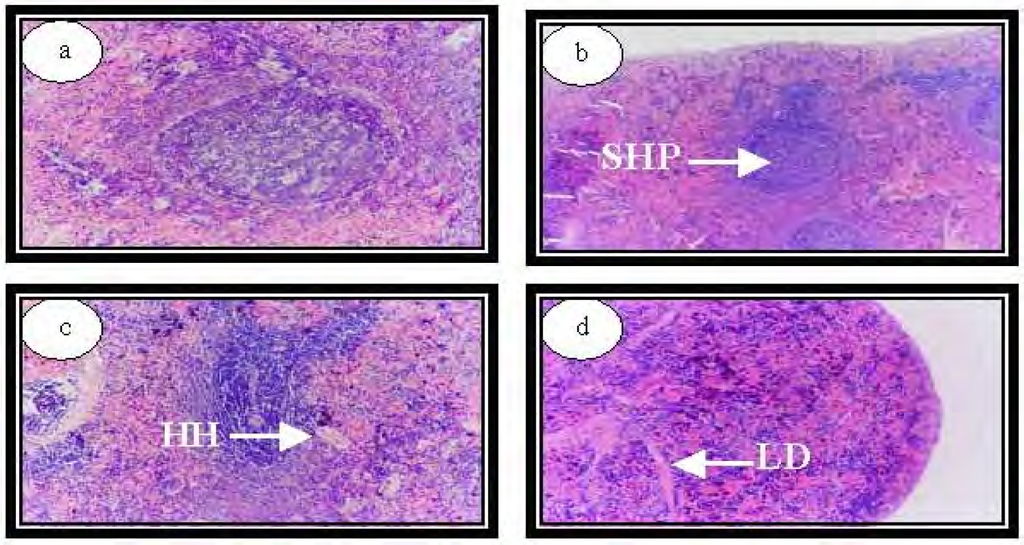 Histopathology of spleen from female rats treated with saline (a) showing normal splenic tissue; AcAaIT (b) showing scattered hemosidrin pigment (SHP) in the splenic red pulps; AcMNPV (c) showing mild hyperplasia of white pulps and hemosidrosis (HH); and SlNPV (d) showing mild lymphoid depletion (LD) (H&E ×300).