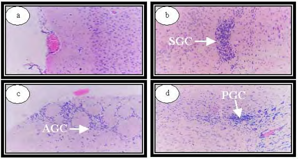 Histopathology of brain from female rats treated with saline (a) showing normal brain tissue; AcAait (b) showing scatterd glial cells (SGC) within the brain tissue; AcMNPV (c) showing aggregation of glial cells (AGC) between nerve fibers; and SlNPV (d) showing proliferation of glial cells (PGC) in the cerebral cortex (H&E ×300).