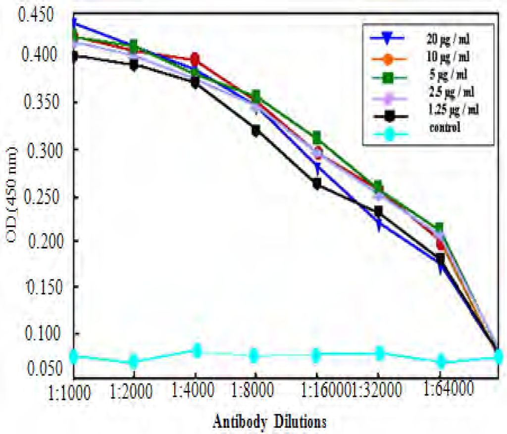 Absorbance at 450 nm using different concentrations of antigen and different dilutions of serum antibody.