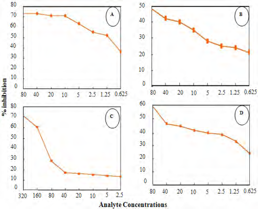 ELISA inhibition curves for 4 analytes: polyhedrin from AcAaIT (A), AcAaIT-field (B), AcMNPV (C), and SlNPV (D). Reagent concentrations: antiserum 1:4,000 (final dilution in wells); AcAaIT polyhedrin (2.5 μg/ml) was used as the coating antigen.