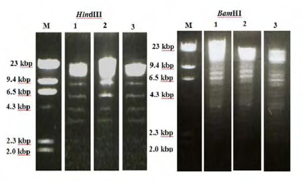 Restriction endonuclease profiles of DNAs isolated from AcAaIT (lanes 1), AcAaIT-laboratory (lanes 2), or AcAaIT-field (lanes 3) following treatment with HindIII or BamHI and electrophoresis in a 0.8% agarose gel. The sizes of molecular weight standards of lambda phage DNA digested with HindIII (lanes M) are indicated to the left.