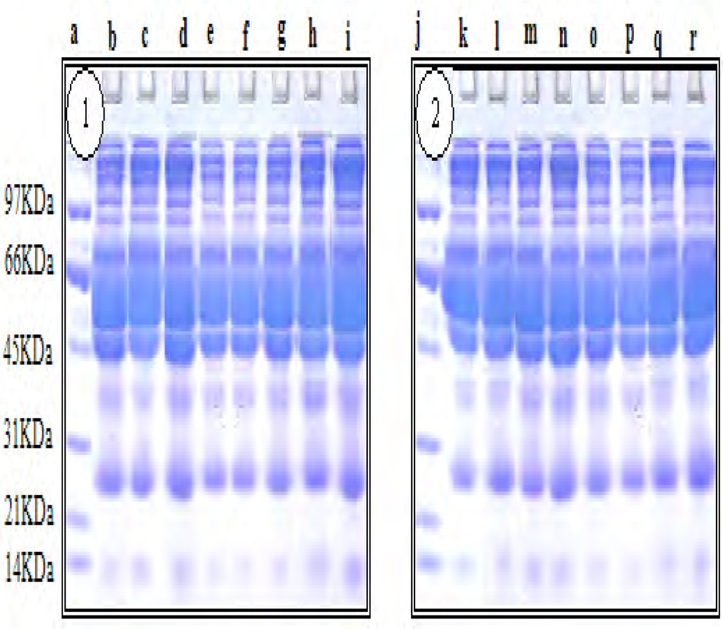 SDS-PAGE of serum proteins from rats at 21 days post oral treatment (panel 1) or intraperitoneal injection (panel 2) of baculovirus: control males (lanes b and k), control females (lanes c and l), SlNPV exposed males (lanes d and m), SlNPV exposed females (lanes e and n), AcMNPV exposed males (lanes f and o), AcMMPV exposed females (lanes g and p), AcAaIT exposed males (lanes h and q), AcAaIT exposed females (lanes i and r). The sizes of molecular weight standards (lanes a and j) are indicated to the left of panel 1.