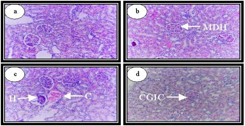 Histopathology of kidney from female rats treated with saline (a) showing normal renal tissue structures; AcAaIT (b) showing mild dilation and hyperemia (MDH) of glomerular capillaries; AcMNPV (c) showing congested (C) renal blood vessels and hypercellularly (H) of some glomeruli; and SlNPV (d) showing congested glomeruli and interregnal capillaries (CGIC) (H&E ×300).
