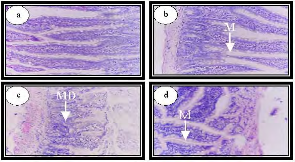 Histopathology of intestine from female rats treated with saline (a) showing showing apparently normal intestinal mucosa; AcAaIT (b) showing metaplasia (M) to goblet cells in the villus epithelium; AcMNPV (c) showing mucinous degeneration (MD); and SlNPV (d) showing mild mucus and metaplasia (M) of intestinal epithelium to global cells (H&E ×300).