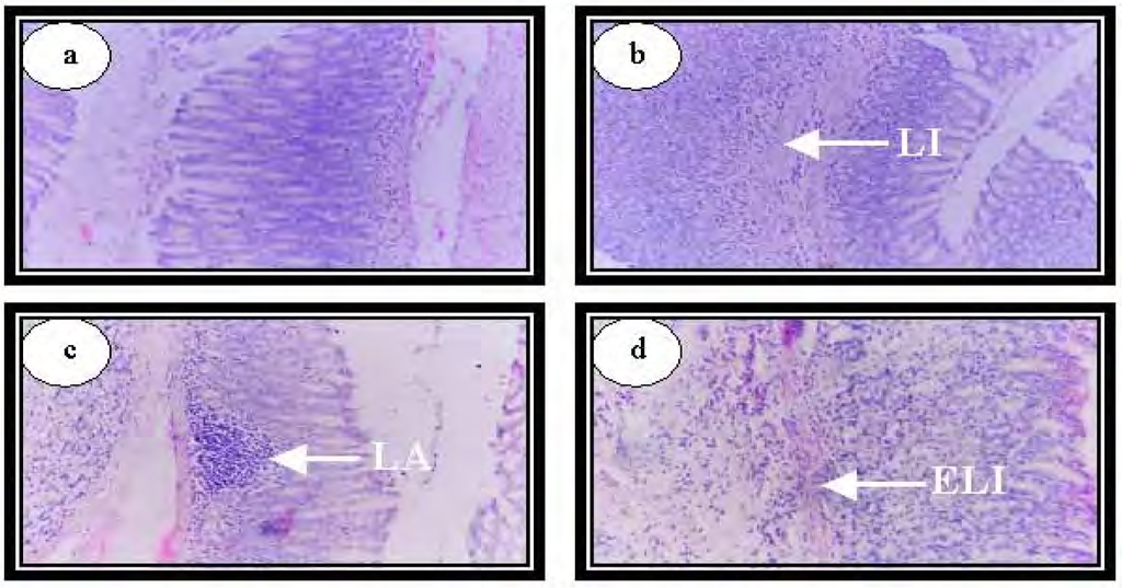 Histopathology of stomach from female rats treated with saline (a) showing normal gastric mucosa; AcAaIT (b) showing leukocytic infiltration (LI) in mucosa and submucosa; AcMNPV (c) showing lymphocytic aggregation (LA) in gastric mucosa; and SlNPV (d) showing edema and leukocytic infiltration (ELI) in gastric submucosa (H&E s300).