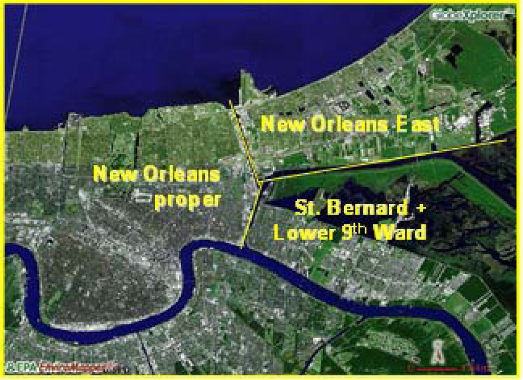 Map of New Orleans and neighboring areas showing the partitioning of the pump-out. Flood waters from New Orleans proper and New Orleans East were largely pumped into Lake Pontchartrain. Flood water from St. Bernard Parish and the Lower Ninth Ward of New Orleans were largely pumped into Violet Marsh.