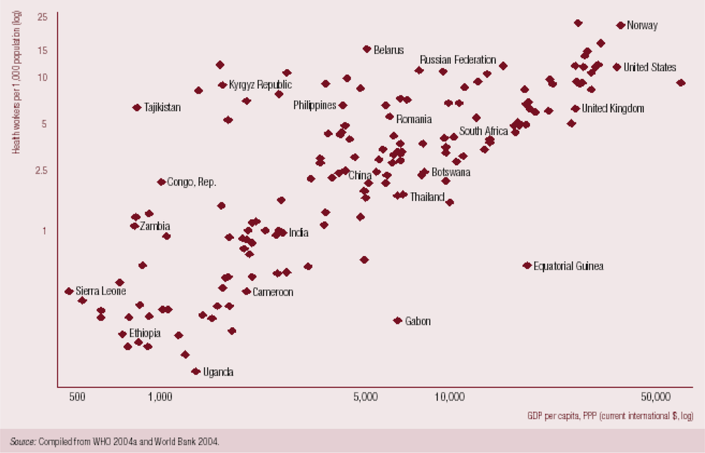 In general, countries with higher per capita GDP and incomes have more health workers (Figure 1). Norway and the United States of America are among the countries with the highest per capita income and the greatest density of health workers per 1000 population. Most countries in sub-Saharan Africa have the lowest per capita income as well as the lowest health worker density. However, some exceptions exist where countries with abundant material resources and high income (e.g. Gabon and Equatorial Guinea) still have relatively inadequate numbers of health workers. Inequities also exist within countries, with urban, wealthier areas having greater proportions of all trained health workers than rural and poorer areas of countries.
