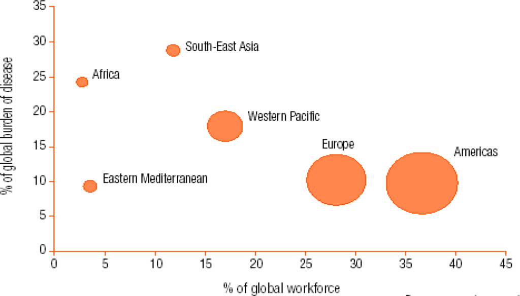 Distribution of health workers by burden of disease, by WHO regionSource: WHR 2006