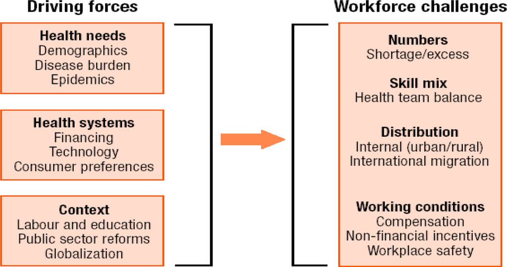 There are numerous forces (“push” and “pull” factors) that influence the health workforce crisis in sub-Sahara. These range from “driving forces” to “workforce challenges” (figure 5) seeking to describe and to explain the extent and the rationale of the crisis.