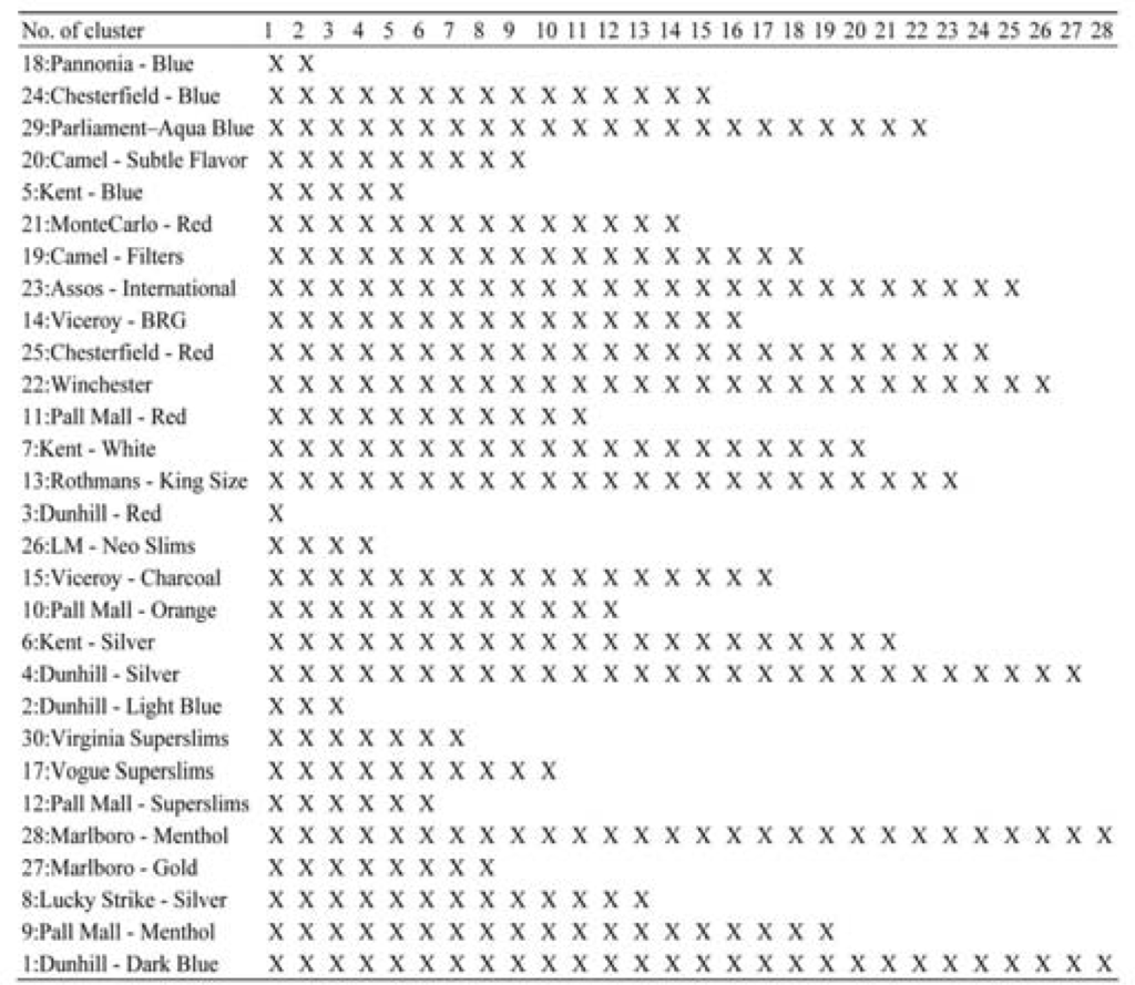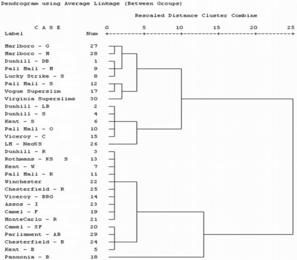 Analyzing the agglomeration schedule revealed that there is no difference between Marlboro - Gold and Marlboro - Menthol (Philip Morris) or between Dunhill -Silver and Dunhill - Light Blue (British American Tobacco). Note that these two brands (Marlboro - Gold and Marlboro – Silver, see Table 1) are identical in terms of tar, nicotine and carbon monoxide concentrations and have the same price. The same observation is true for Dunhill - Silver and Dunhill - Light Blue (see Table 1). Thus, it can be expected to found the Marlboro - Gold and Marlboro - Menthol in one cluster, and Dunhill – Light Blue and Dunhill Silver in another cluster (which it was happen, see Figure 2).