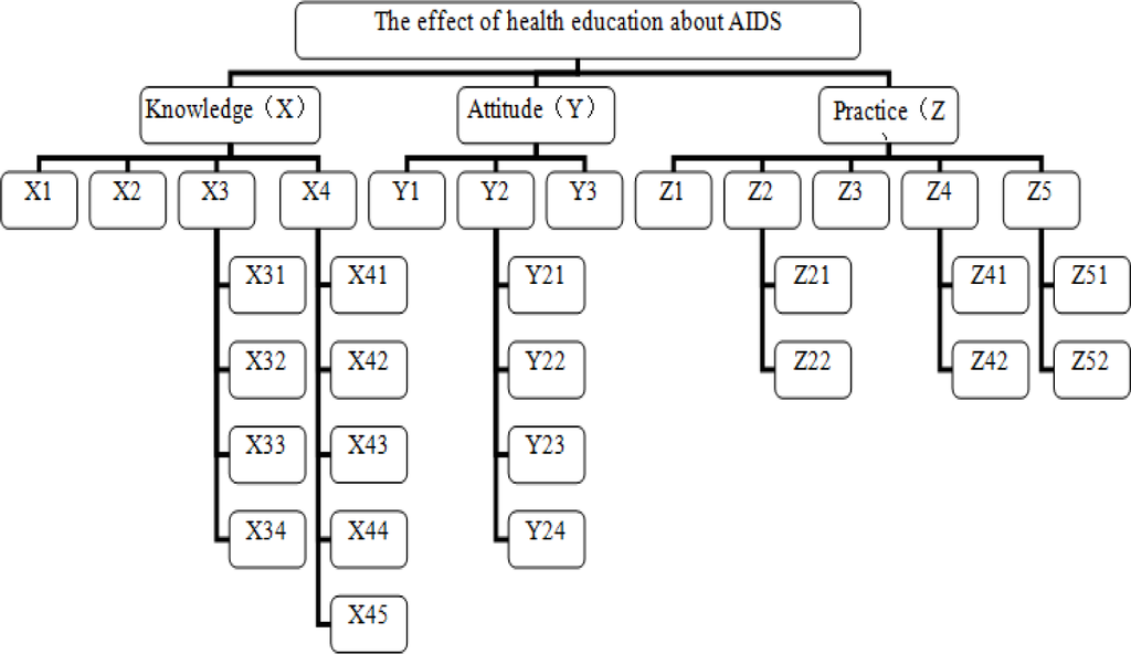 The overall goal is divided into four levels. The first level is the overall goal (the effect of KAP health education about HIV); the second is the three major variables (knowledge, attitude and practice); the third and the fourth are n alternatives that must be compared and assessed. The tree structure is showed in figure 2.