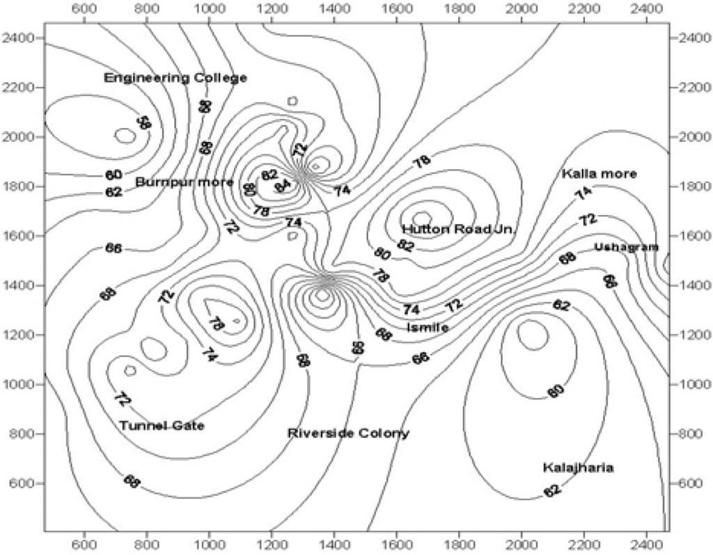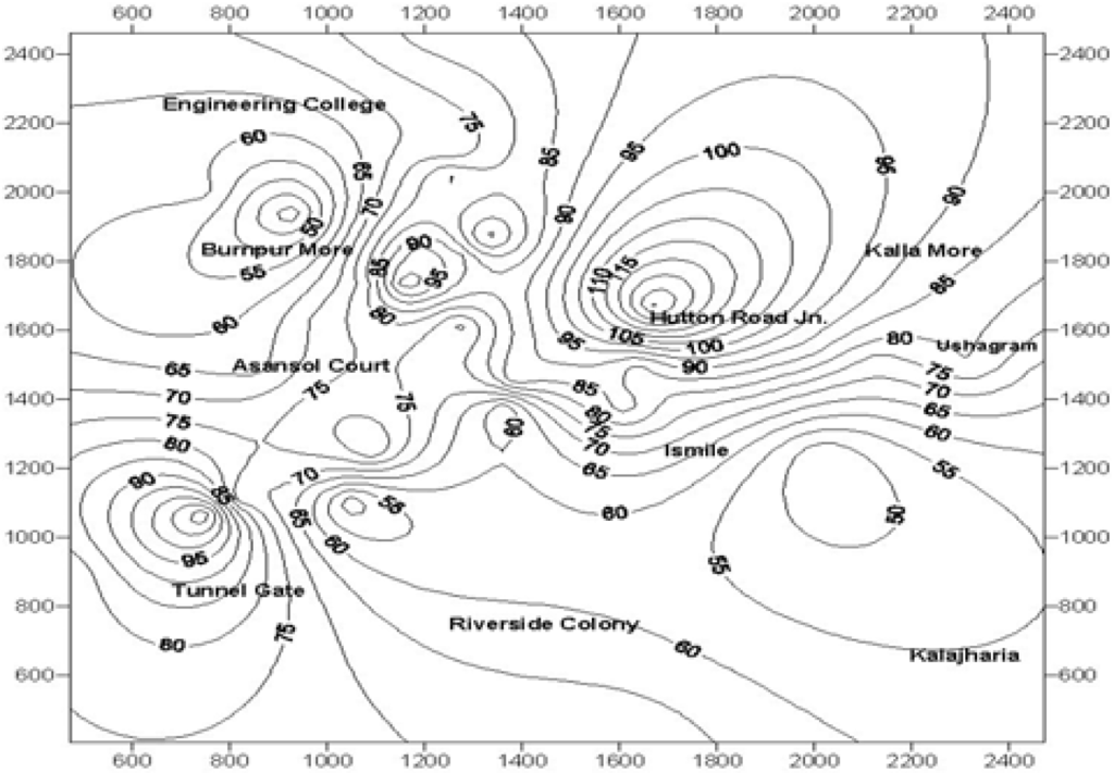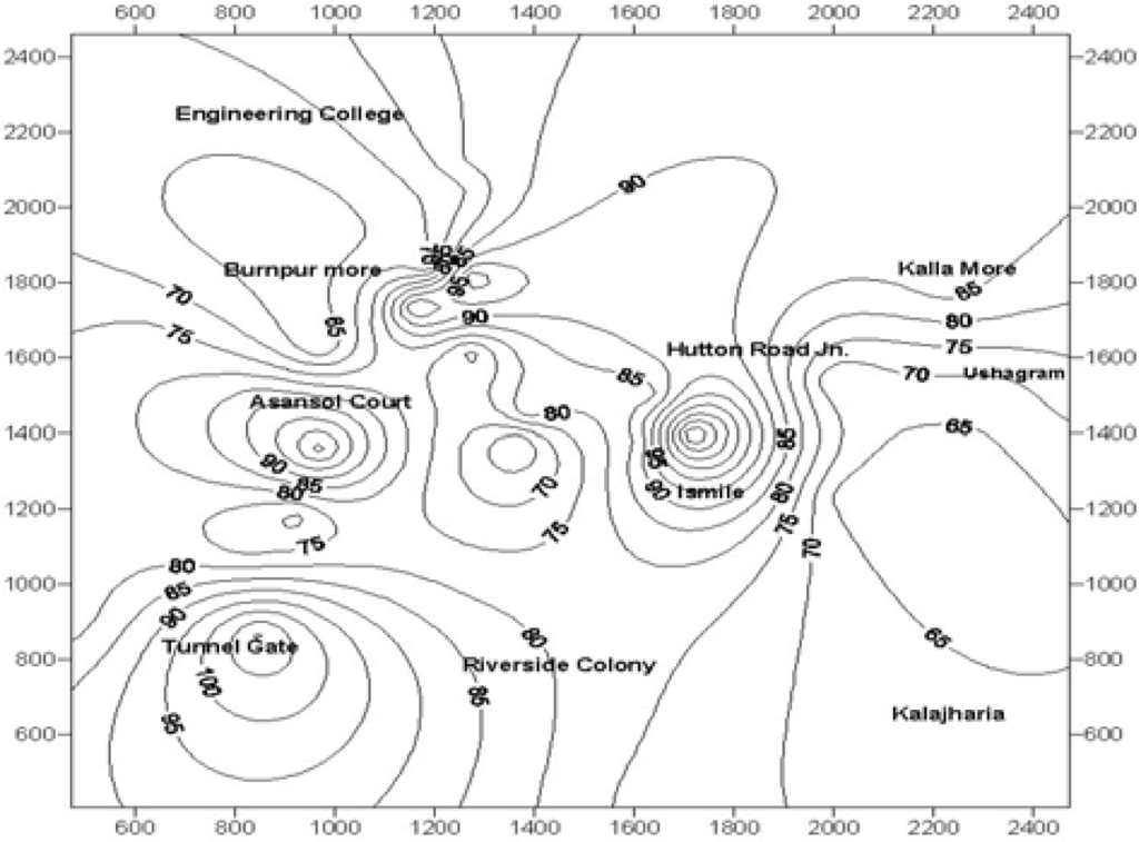 Isopleths of Day Time Equivalent Noise Level (Leq) at Asansol during study period [Noise Contour Map based on Equivalent Noise level (Leq) for Day-time period]
