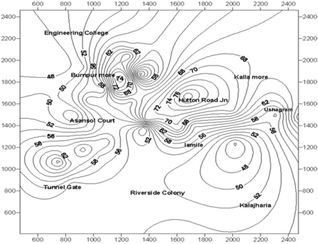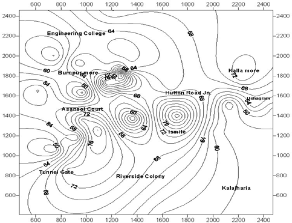 Isopleths of Night Time Equivalent Noise Level (Leq) at Asansol during study period [Noise Contour Map based on Equivalent Noise level (Ldn) for Night-Time period]