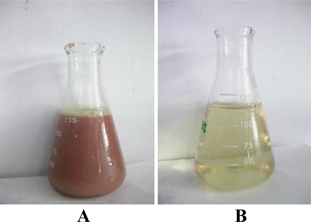 Table 1 shows the comparison of POME before and after EC. Electrocoagulation of the POME afforded a clear solution from a dark brown, opaque effluent (Figure 1).