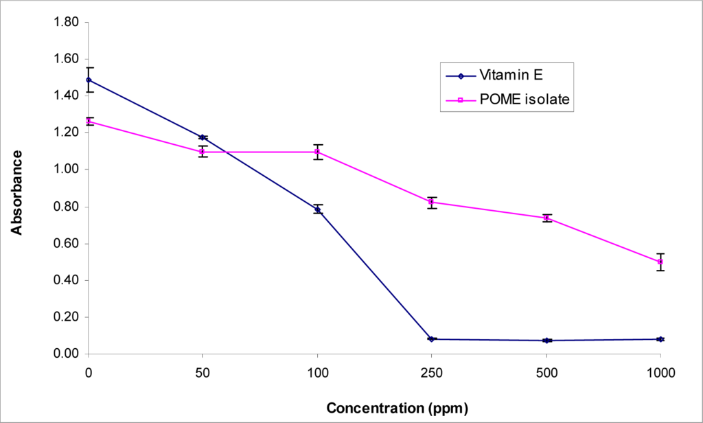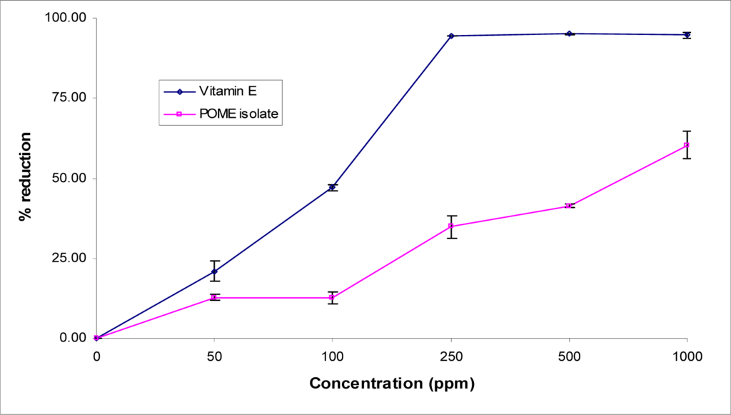 Shown in Figure 3 is the plot of the percentage reduction in DPPH radical at various concentrations of antioxidant. The POME isolate gave only 60.34 % reduction at 1000 ppm concentration, while Vitamin E gave 94.68% at the same concentration. Calculation of the equation of the line for each curve enabled the determination of the EC50, the effective concentration of the antioxidant at which 50% of the activity of the DPPH radical has been reduced. For Vitamin E, the EC50 was determined to be 106 ppm while that of the POME isolate was 723ppm. The antioxidant activity of the POME isolate could possibly be increased by further purification.