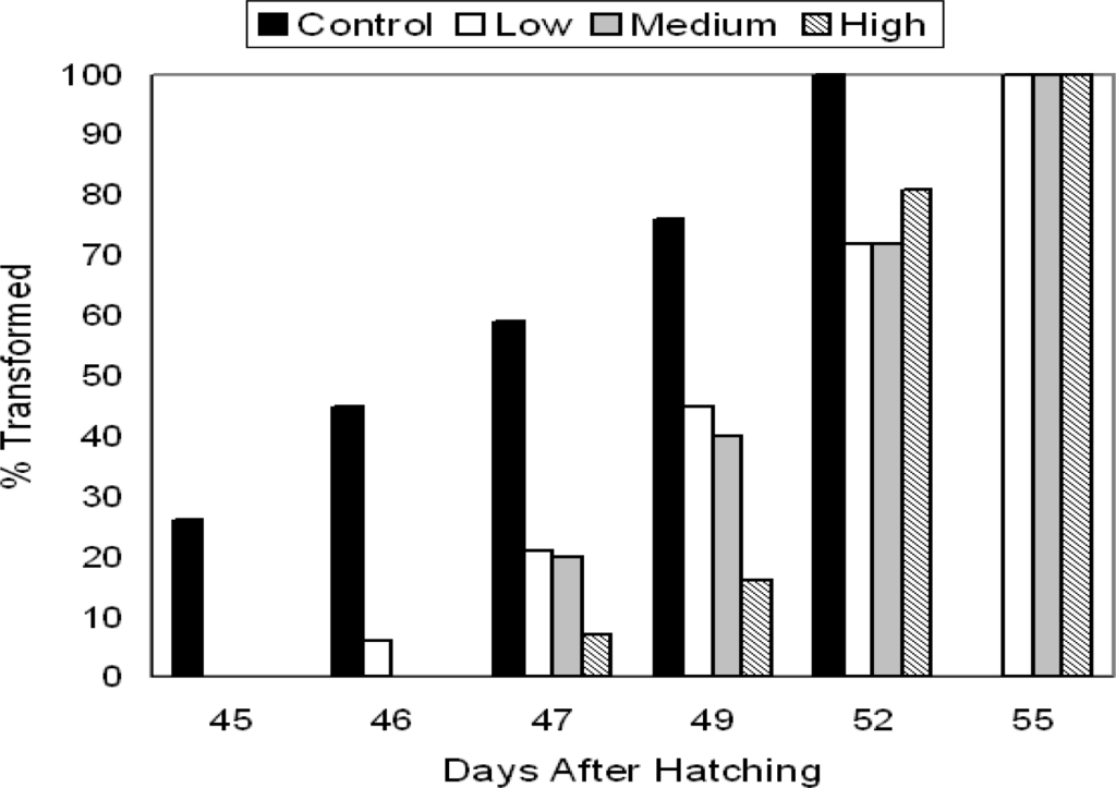 Time (days) required for 48 h control and TCDD-treated P. triseriata larvae to reach metamorphosis. Control P. triseriata completed metamorphosis more rapidly than TCDD- treated animals. Eggs were originally exposed for 48 h to waterborne concentrations of TCDD as follows: low (0.3 μg/l), medium (3.0 μg/l), and high (30.0 μg/l).