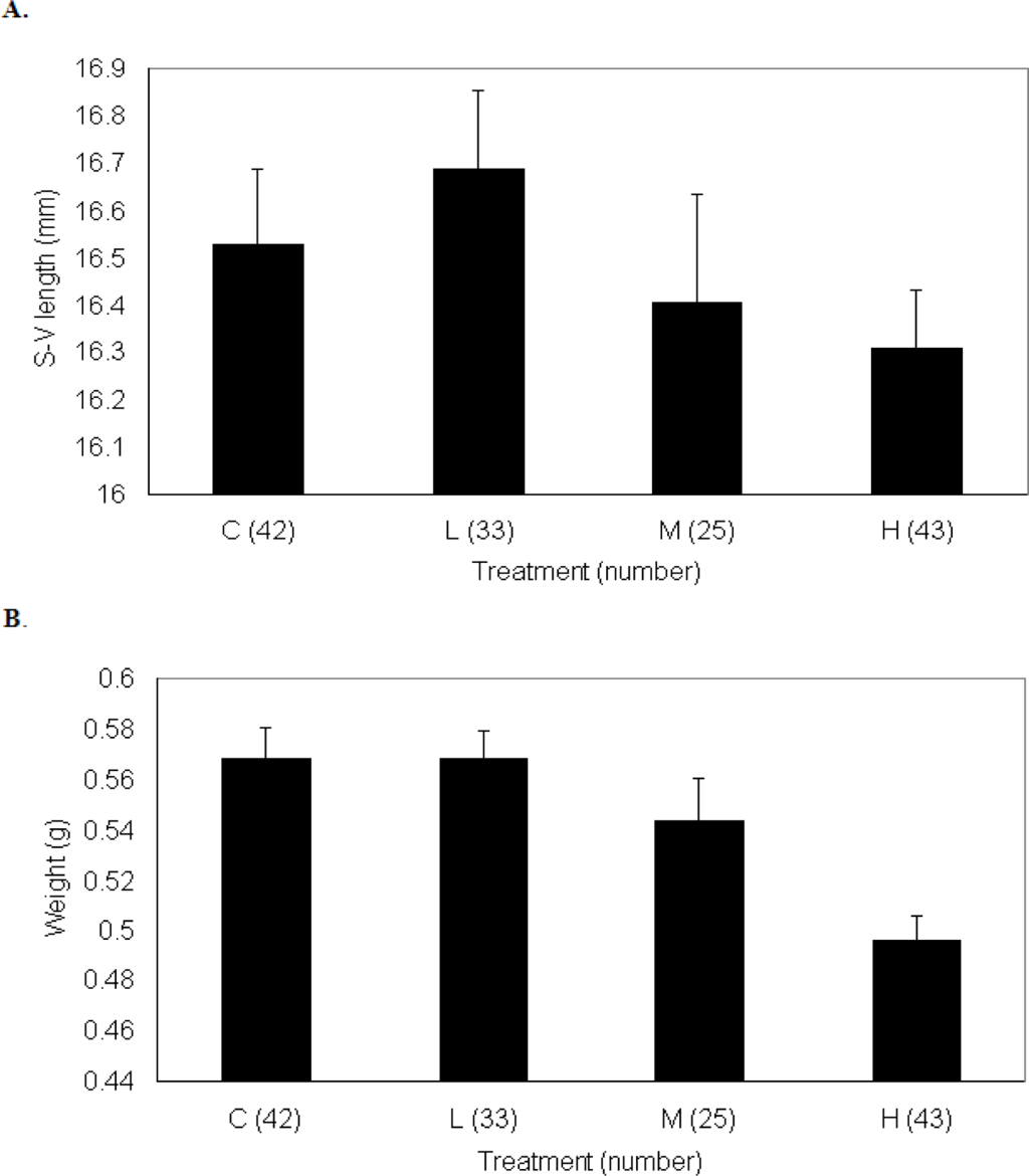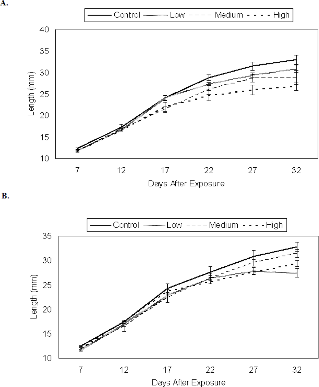Larval growth of P. triseriata among control and 48 h TCDD treatments expressed as an increase in, a) total length (mm) and, b) weight (g) over time. Each data point represents the average length (± SE) of ten randomly selected larvae. Eggs were originally exposed for 48 h to waterborne concentrations of TCDD as follows: low (0.3 μg/l), medium (3.0 μg/l), and high (30.0 μg/l). Control P. triseriata were statistically longer, but not heavier than TCDD-treated larvae on the final sampling day (day 40)