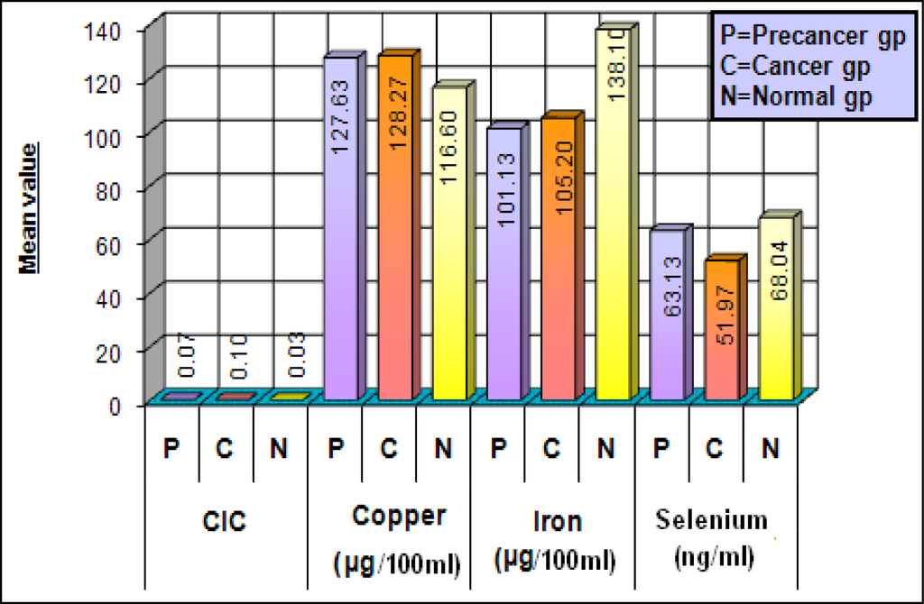 In assessment for several trace elements, the concentrations in serum are often used as an index. The importance of these elements in cancer was reported by Schwartz (1975) [20] which opened the door for new diagnostic and therapeutic endeavors in many areas of medicine and specifically in the areas of oncology. Immunological and biochemical alterations in the serum of such patients can help not only in the early diagnosis and treatment but also in prognosis, as the disease progresses.