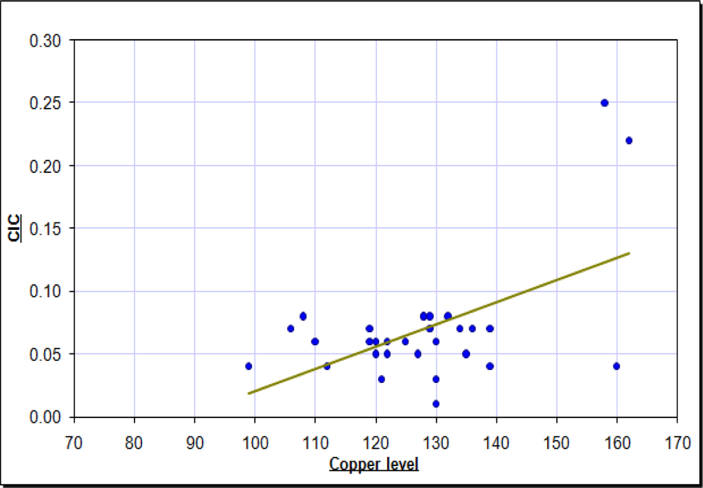 A significant positive correlation was present between the serum circulating immune complexes levels and copper in the precancer group. Both parameters showed a steady increased (Figure 2). A significant positive correlation was found between age of subjects and circulating immune complexes. Estimation of CIC and trace elements might help in early detection, differential diagnosis and treatment planning of oral premalignant and malignant lesions.