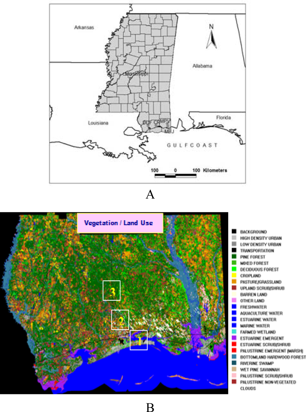 Location of the study region (a) and Vegetation / Land use of the Mississippi Gulf coast region (b). The experimental locations are Sea bee base (1), Harrison (2) and Wiggins (3).