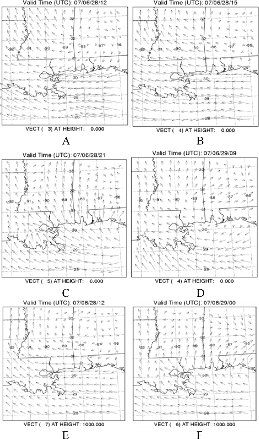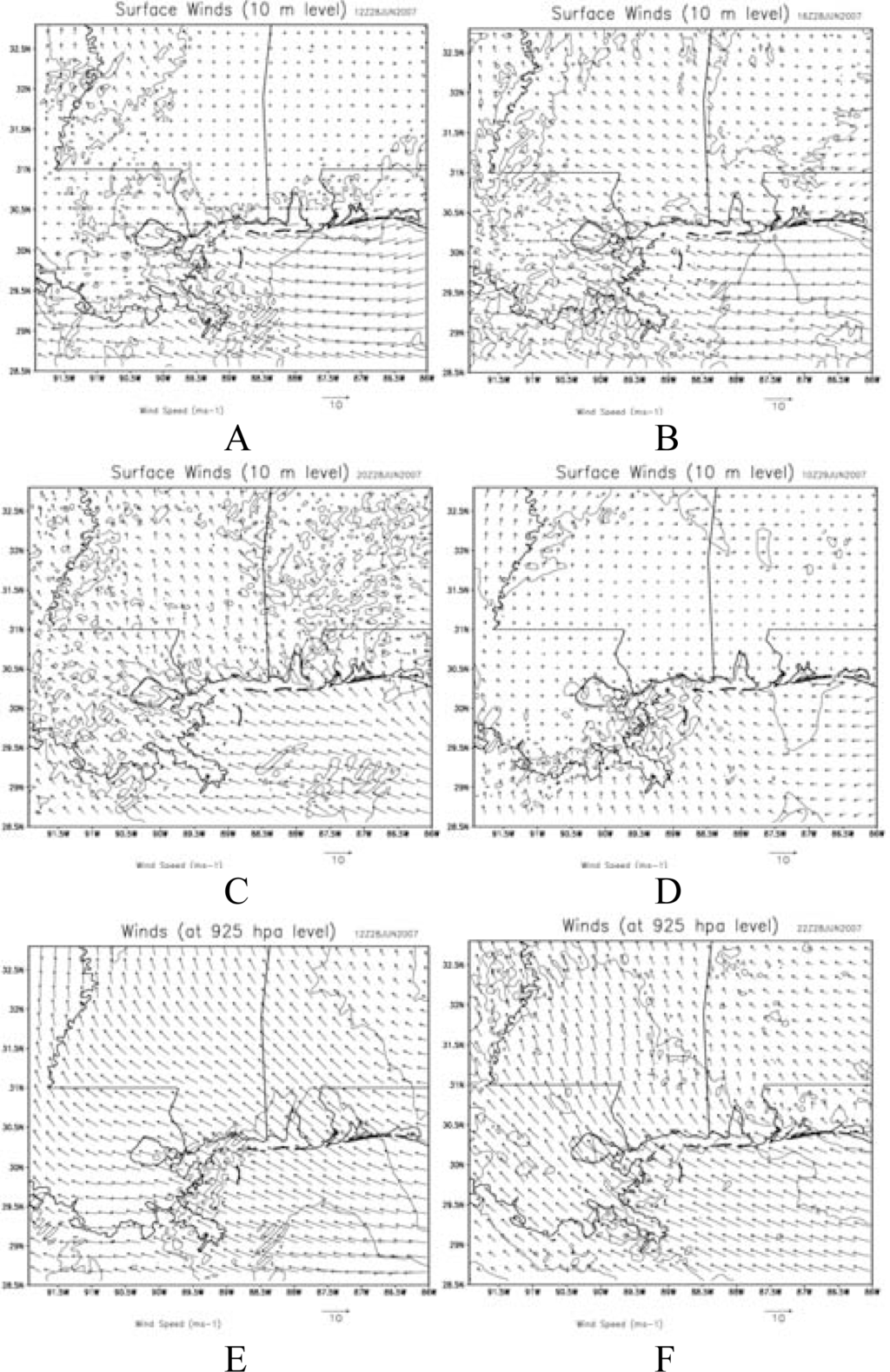 Simulated wind pattern in the MS Gulf coast region for 28–29 June, 2007. Panels a,b,c,d-for the surface wind and panels e,f-for winds at 925 hPa (∼1km) level.