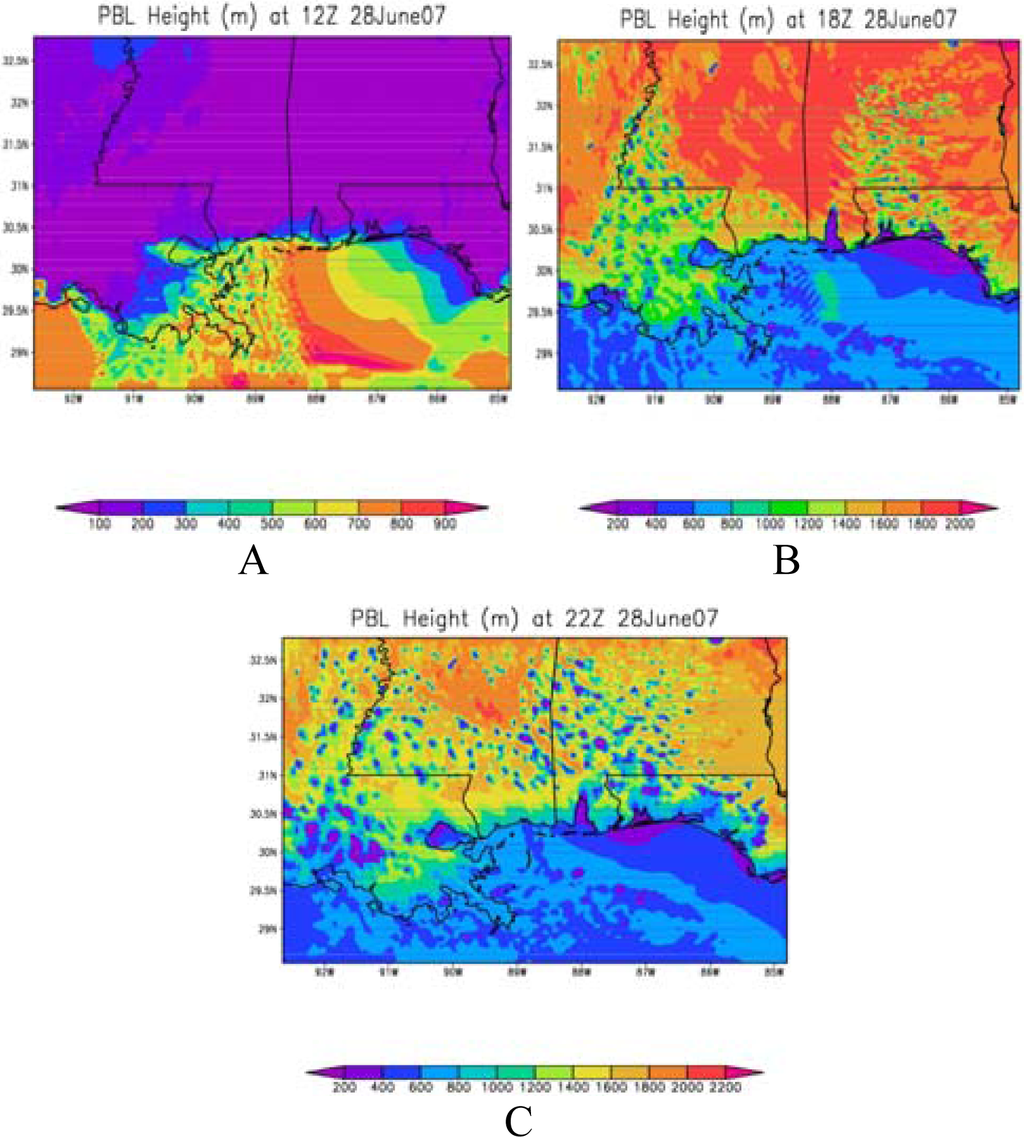 The field meteorological experiment conducted at three different locations across the MS Gulf coast during the summer season has given opportunity to gain an insight on the PBL characteristics across the coast and to measure the mixing depth and its diurnal variation across the coast. Mixing depth increased progressively from coast to inland, the PBL height was 600–700 m at Sea Bee base , 1000–1500 m at Harrison and 1400–2000 m AGL inland. Boundary layer field experiment reveals formation of thermal internal boundary layer adjacent to the coast, the height of this shallow IBL is about 100 m at the coast, and 300 m about 15 km inland. Wind speeds increase during the sea breeze time, and significant change in the meteorological parameters is noticed at the sea breeze occurrence. A meso-scale model WRF with triple nested domains was used to simulate the meteorological parameters in the MS Gulf coast. The experiment data was used to validate the WRF model which simulated the flow and PBL structure in the region. The simulation results closely agreed with the GPS Sonde observations. The model could bring out the observed vertical structure and the mixing depth variations across the coast although there was a slight lag in the simulated daytime peak values. The WRF model could reproduce the flow and many of the observed characteristics of the coastal ABL and hence could be useful in dispersion / air quality studies in the region. Both the model and the observations indicate shallow unstable layer and sea breeze incidence at the coastal location. The dispersion simulation using HYSPLIT model with WRF data has shown the expected diurnal variations in the plume direction and concentration distribution. However exhaustive studies with WRF and Community Multiscale Air Quality (CMAQ) Model need to be conducted to understand the ozone transport and pollution episodes in the region which require generation of high resolution emission inventory for the study region. The present experiment has given valuable data base on the boundary layer structure across the coast useful for validation of the numerical models used in dispersion assessment.