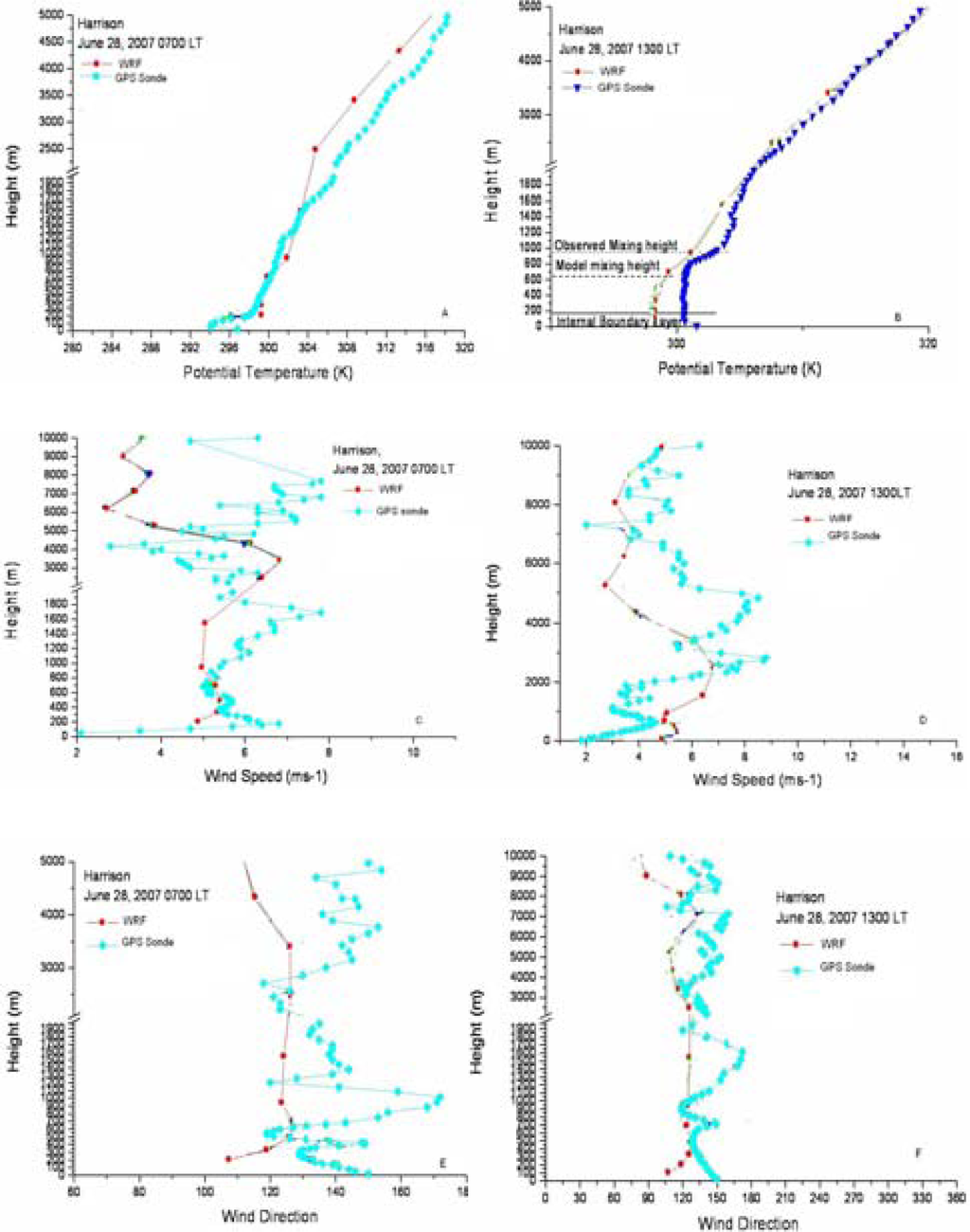 Simulated and observed vertical profiles of potential temperature at 07 UTC (a), 13 UTC (b), wind speed at 07 UTC (c), 13 UTC (c) and wind direction at 07 UTC (e), 13 UTC (f) for the Harrison location