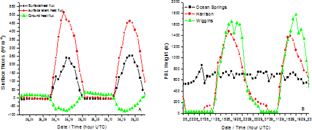 WRF simulated surface fluxes at Harrison (a) and simulated boundary layer height at Ocean Springs, Harrison and Wiggins.