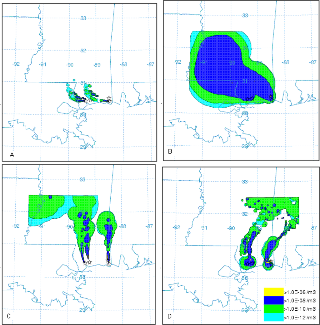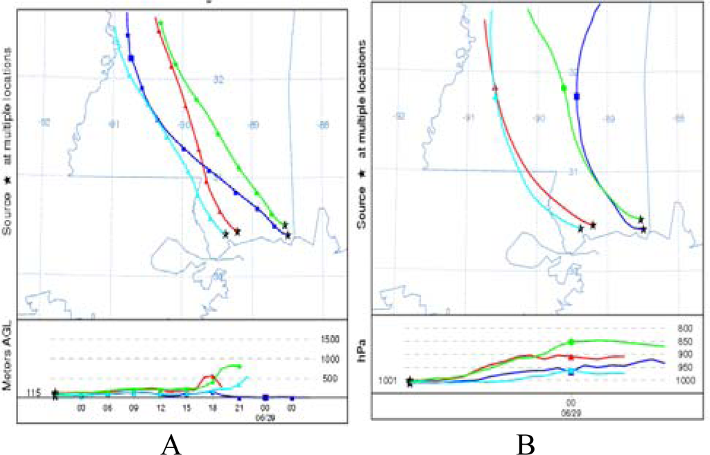 Simulated forward particle trajectories from HYSPLIT model using WRF wind fields are presented in Fig.16. The air mass trajectory follows the stream line. Trajectories originating at different starting times from the point sources are seen to travel to different locations on the Mississippi coast indicating the influence of time varying circulation. Initially the synoptic flow steers the trajectories in the northwest direction (Fig.16), latter they are influenced by the sea breeze circulation and move to north (Fig.8b, c). In each case trajectories indicate influence of the local flow near the coast and the large-scale flow farther away. Trajectories are noticed to confine to the lower atmospheric region below 2 km. The vertical movement of trajectories is noticed to follow the diurnal variations in mixing height variations.
